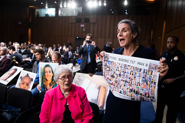 Nadia Milleron, whose daughter Samya Stumo was killed in the crash of Ethiopian Airlines Flight 302, holds a sign with photos of the crash victims during a Senate Commerce, Science and Transportation Committee hearing on aviation safety and the future of the Boeing 737 Max aircraft, in the Hart Building in Washington, D.C., Oct. 29, 2019.