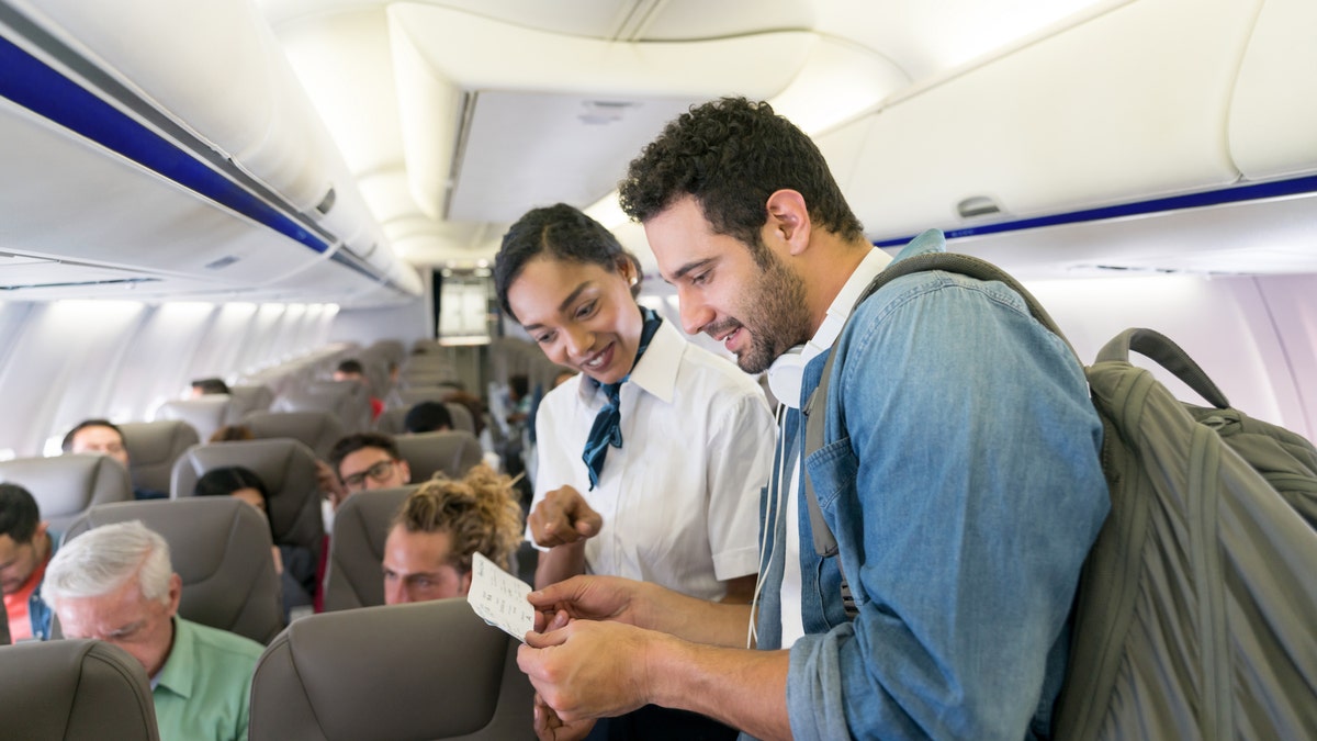 Flight attendant helping man find his seat in an airplane