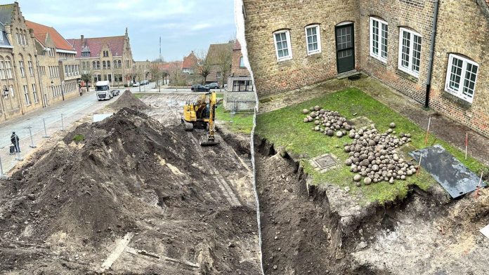 Archaeologists in Belgium uncovered hundreds of medieval cannonballs during excavation work ahead of a planned administrative building project in Nieuwpoort. (Stad Nieuwpoort)
